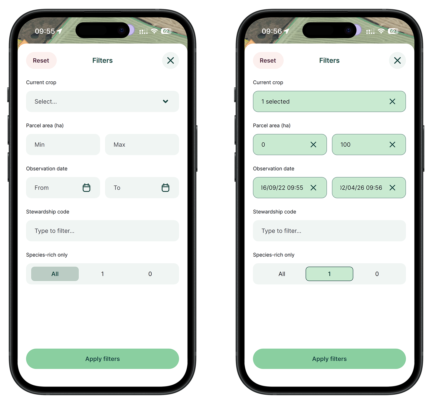 In the Mergin Maps mobile app, go to More → Filters, tap to open it, and set your criteria: the map will update immediately. If filtering has not been enabled in the project settings, the filter UI will not appear at all.