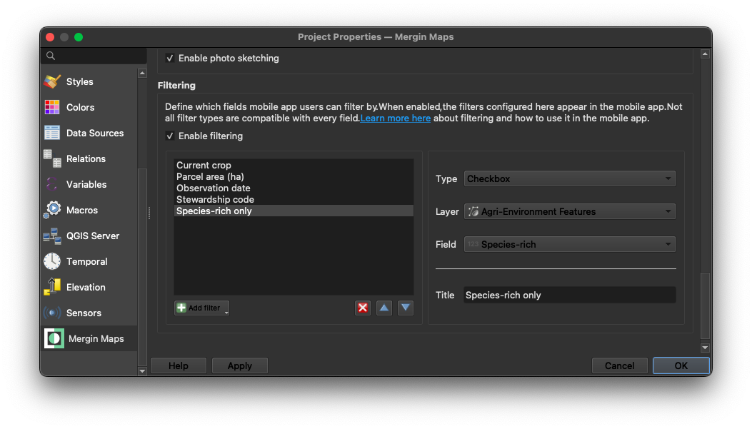 With the Mergin Maps QGIS plugin installed, open QGIS and go to Project → Properties → Mergin Maps. Scroll down to the Filtering section, tick the filtering checkbox, and select which fields should be filterable. Then apply changes and synchronise the project.