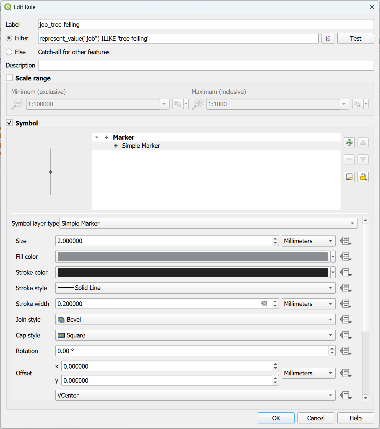 Now we need to make some rules. First we make some symbols to represent the job types using an expression filter for each job type, make sure to use the represent_value() function if the keys and values are different for your value relation widget: