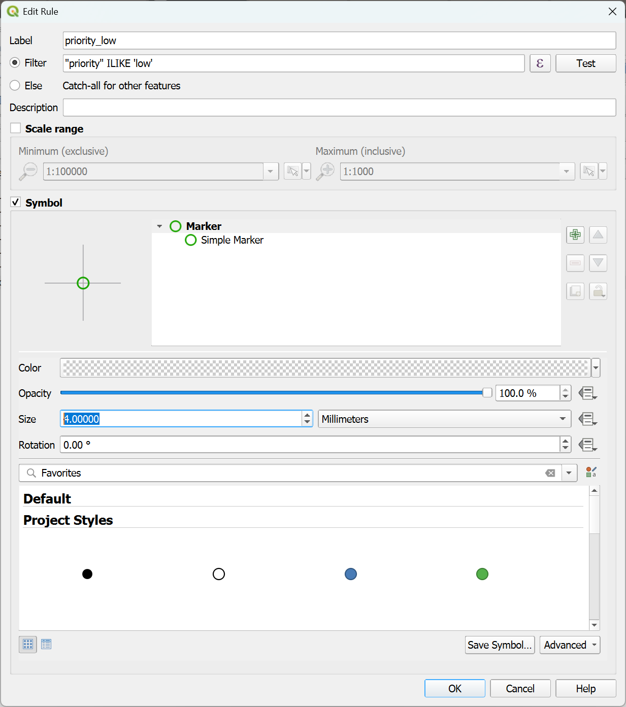 Next we’ll make a symbol for the job priority. We’ll use a simple marker with no fill and a thicker stroke that is coloured to represent the priority level using a filter like: